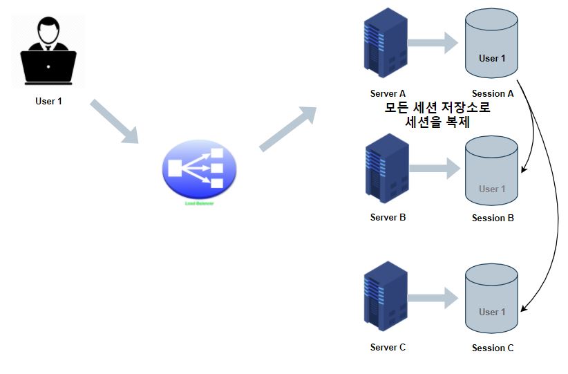 하지만 모든 서버의 세션 저장소에 동일한 세션을 저장해야 하기 때문에 메모리가 효율적으로 관리된다고 보기 어려우며, 서버의 개수만큼 세션을 복제하기 위한 네트워크 트래픽이 발생하기 때문에 성능 상 비효율적일 수 있는 방식이다.