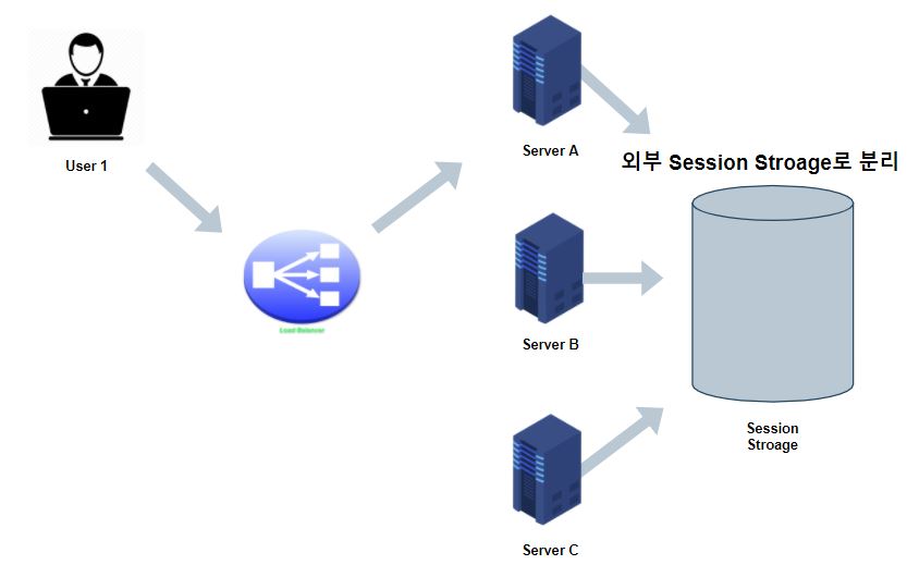 기존의 각 서버가 가지고 있던 Local Session Storage를 외부 Session Storage로 분리하는 방식이다. Session Storage는 휘발성 데이터인 세션의 저장소이기 때문에 당연히 영구적으로 데이터를 저장하며 상대적으로 속도가 느린 Disk 기반 DB 보다는 In-Memory DB가 적합하다.