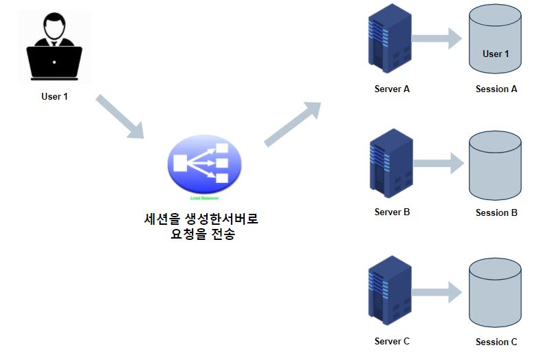 여기서 Session 불일치 문제란 서버마다 각각의 세션 저장소를 가지고 있고 가지고 있는 세션들을 공유하지 않기 때문에 발생하는 문제이다. 예를 들어 특정 유저가 로드 밸런싱을 통해 1번 서버에 접속하여 로그인을 하였고 로그인 정보는 A 서버의 세션 저장소에 저장되었다고 생각해보자. 그 이후 유저가 다시 요청을 보냈을 때 그 요청을 로드 밸런서가 B 서버에 전송한다면 해당 서버의 세션 저장소에는 유저의 로그인 정보가 존재하지 않는 상태이기 때문에 로그인 정보를 얻지 못하는 문제가 발생하는 것이다.